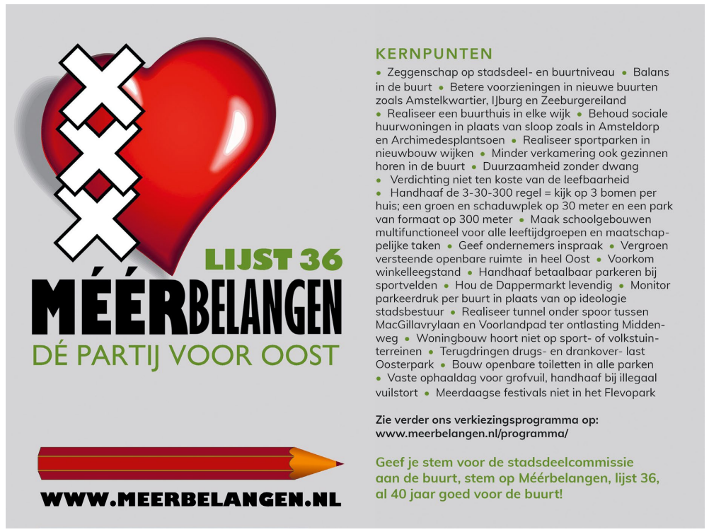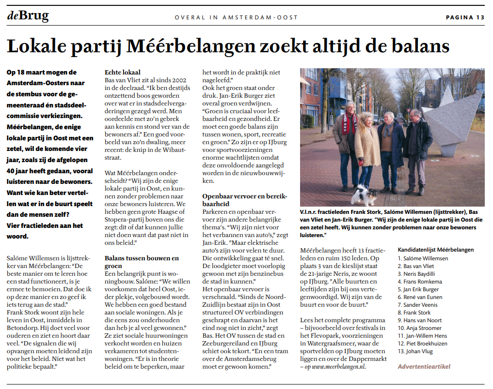 Ondanks het, in vergelijking tot landelijke partijen, bescheiden budget van Méérbelangen, hebben wij toch op een mooie en inhoudelijke manier kunnen adverteren in ‘De Brug’. Hopelijk nemen veel mensen de moeite om het artikel en enkele van onze standpunten te lezen. We hebben een mooie kandidatenlijst en staan in een traditie van 40 jaar, dóór en vóór buurtbewoners. Een stem met hart voor Oost, is een stem voor Méérbelangen!